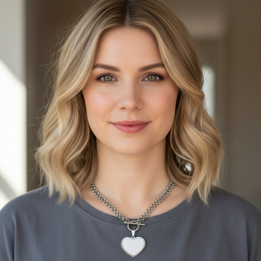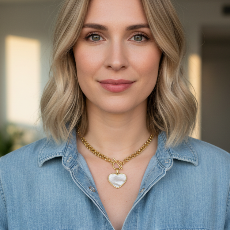 Fio Duplo em Aço Inoxidável om Pendente Coração com Madrepérola no Interior.